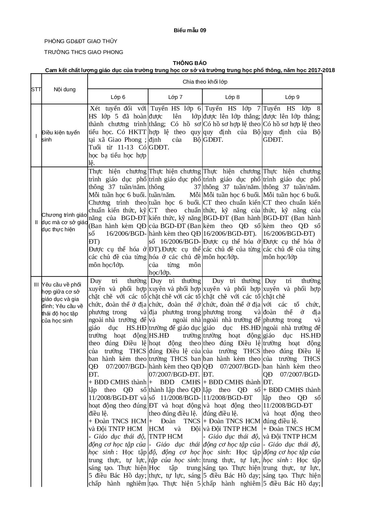 Báo cáo công khai thường niên đầu năm học 2025-2026 theo thông tư 09 trường THCS Giao Phong