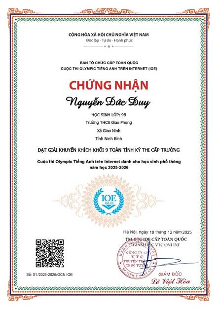 Trong không khí học tập sôi nổi của năm học 2025–2026, Trường THCS Giao Phong đã tổ chức kì thi Olympic Tiếng anh trên Internet (IOE) cấp trường – một sân chơi trí tuệ bổ ích, hiện đại và đầy hứng khởi dành cho học sinh yêu thích môn Tiếng Anh.